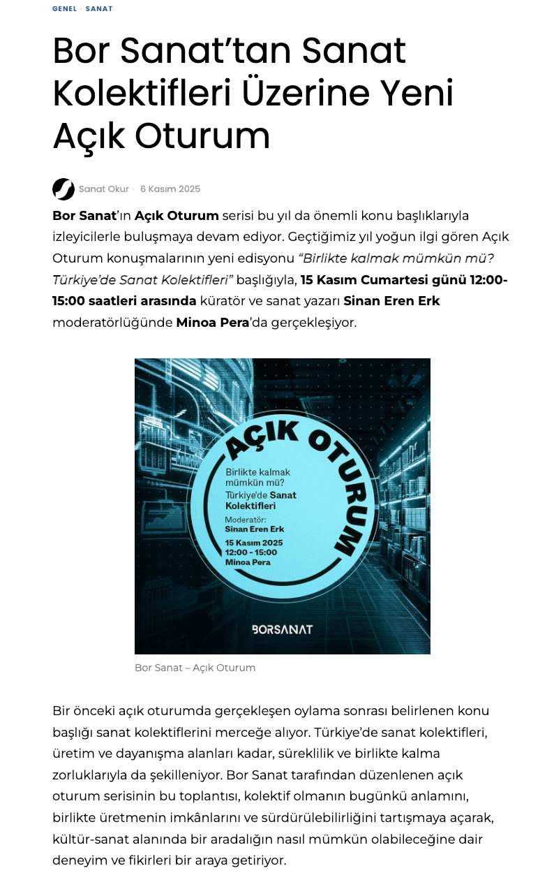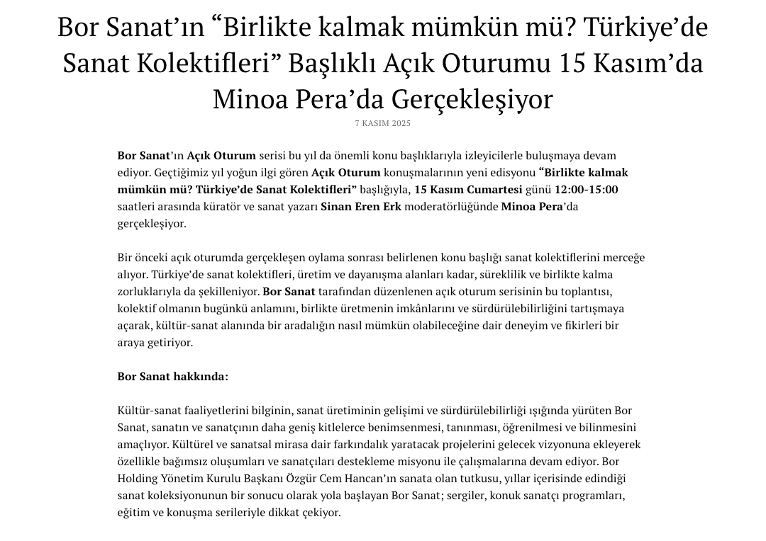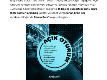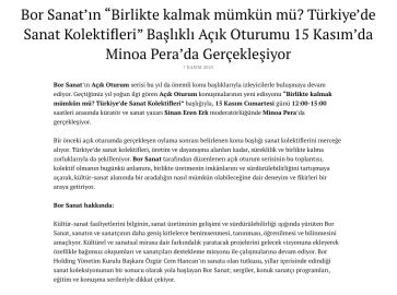 Eser Adı: Bor Sanat’ın “Birlikte kalmak mümkün mü? Türkiye’de Sanat Kolektifleri” Başlıklı Açık Oturumu 15 Kasım’da Minoa Pera’da Gerçekleşiyor