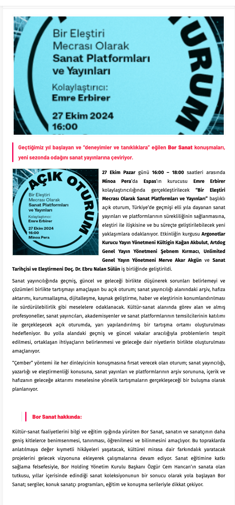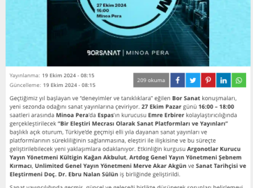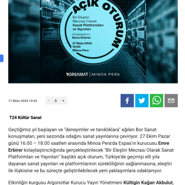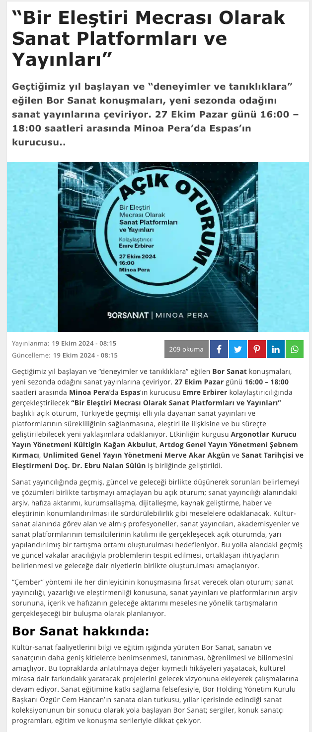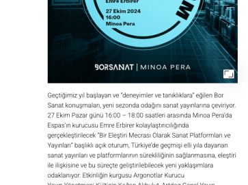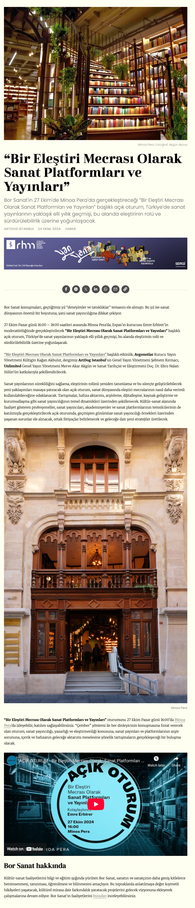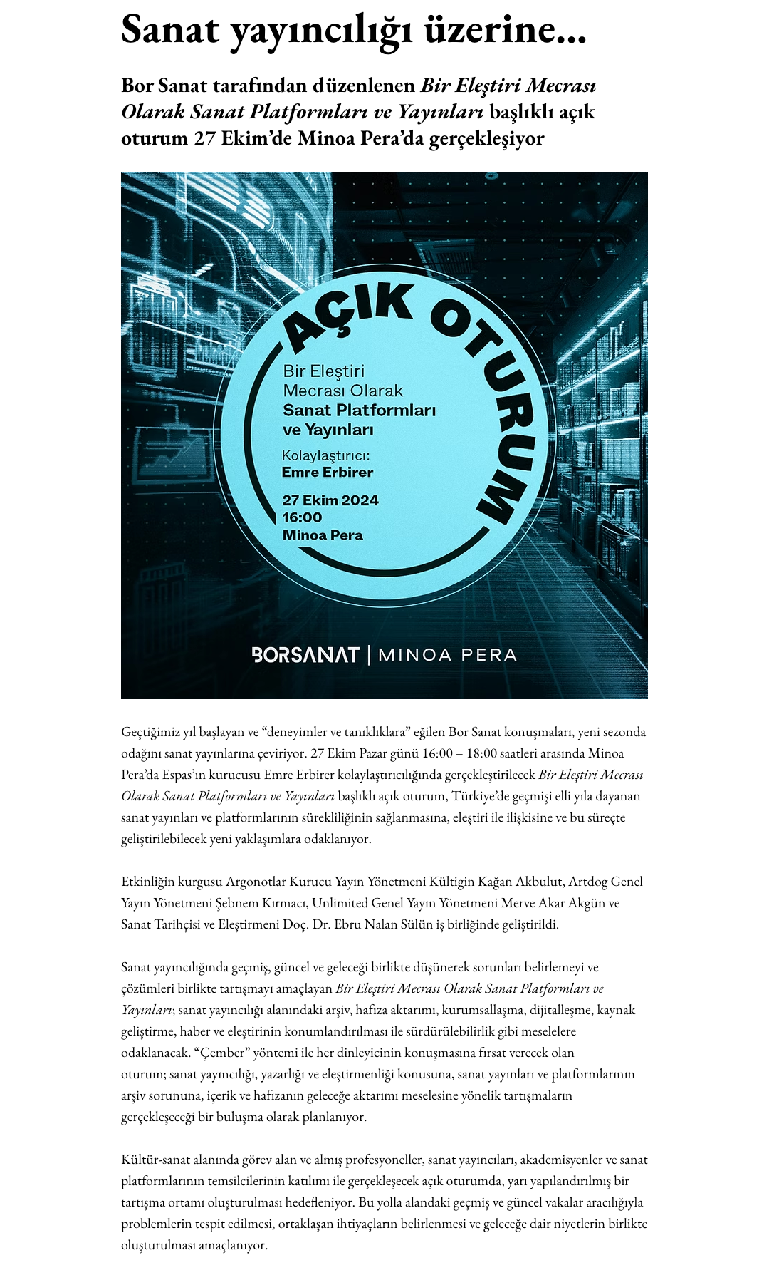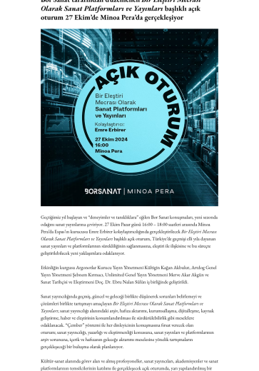 Eser Adı: Bor Sanat’ın “Bir Eleştiri Mecrası Olarak Sanat Platformları ve Yayınları” Başlıklı Açık Oturumu 27 Ekim’de Minoa Pera’da Gerçekleşiyor