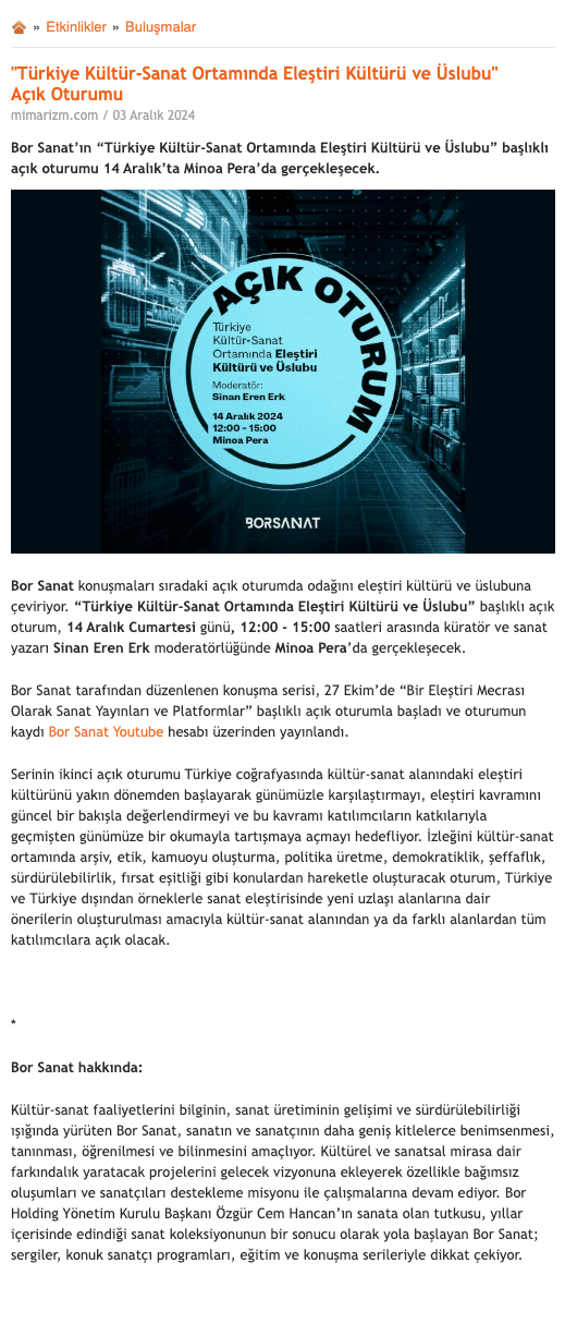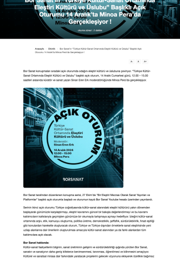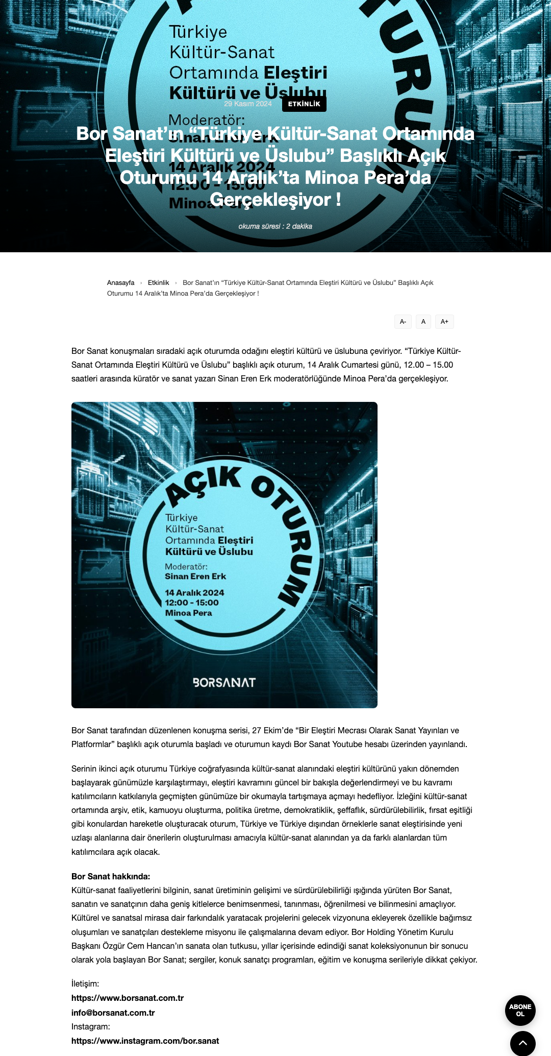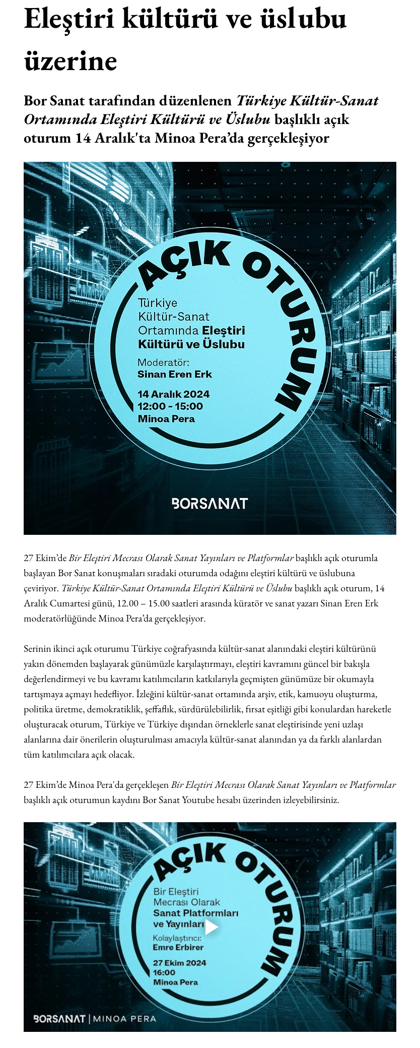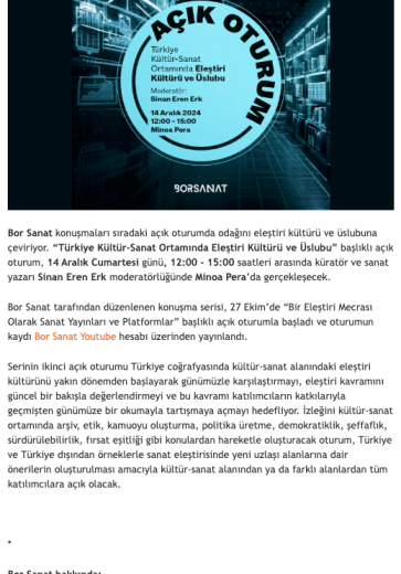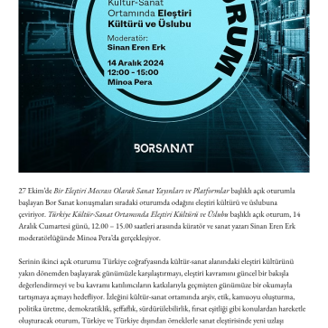 Eser Adı: Bor Sanat'ın "Türkiye Kültür-Sanat Ortamında Eleştiri Kültürü ve Üslubu" Başlıklı Açık Oturumu 14 Aralık'ta Minoa Pera'da Gerçekleşiyor!