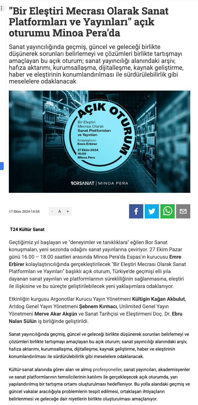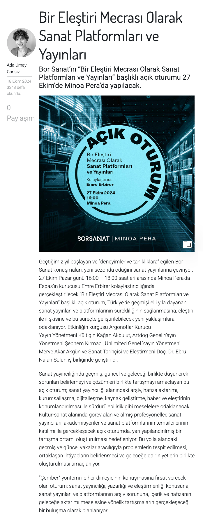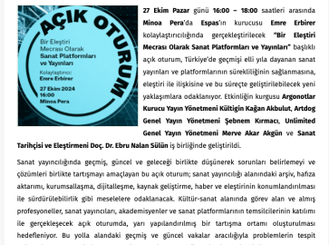 Eser Adı: "Bir Eleştiri Mecrası Olarak Sanat Platformları ve Yayınları" açık oturumu Minoa Pera'da
