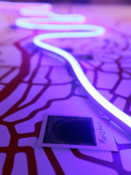 Bu yerleştirme çalışması, Mardin’in suyla kurduğu mekânsal ve belleğe dair ilişkiyi harita, ışık ve ses yoluyla yeniden yorumlamaktadır. Eski Mardin’in Google Maps referansıyla oluşturulan harita formu üzerine yerleştirilen mavi neon çizgi, Mardin’deki çeşmelerin yer aldığı güzergahları temsil eder. Neonun ışığı, sadece bir su yolunu değil, aynı zamanda artık akmayan çeşme sularının yokluğunu görünür hale getirir. Su sesi ise; çalışmanın mekân ve hafızayla kurduğu ilişkiyi derinleştirir. Çalışmanın hem görsel hem işitsel hem de mekânsal unsurları bir arada kullanması, izleyiciyi yeniden hatırlama sürecine davet eder. Bu yerleştirme; Serhat Kiraz ile birlikte Bor Sanat ve EXIT iş birliğiyle yürütülen konuk sanatçı programı sürecinde şekillenmiş, ortak üretimin düşünsel ve biçimsel izdüşümlerini taşımaktadır. Ortaya çıkan bu iş, bireysel üretimle kolektif diyaloğun kesiştiği bir eşikte durur.